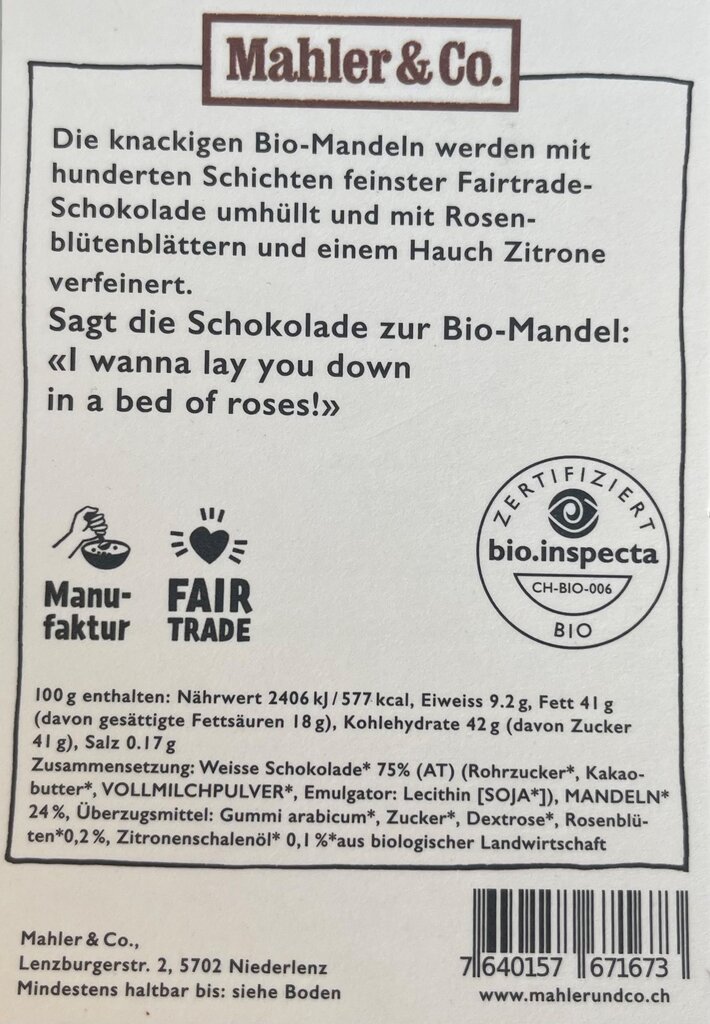 Mahler Mandel in Zitronen-Rosenblütenschoggi 140g (Saisonprodukt: Ostern)