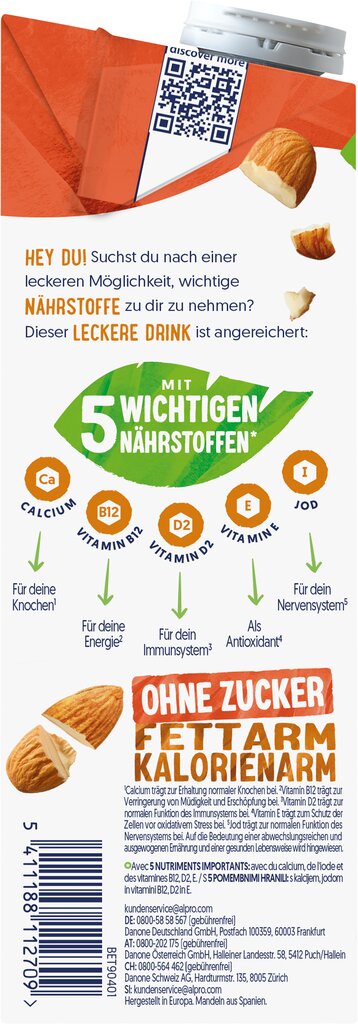 Mandeldrink angereichert mit Calcium, Jod und den Vitaminen B12, D2, E. Ultrahocherhitzt.