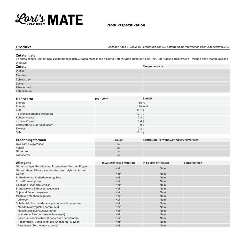 Wasser, Mate- und Schwarztee, Zucker, Zitronensaft, Kohlensäure
